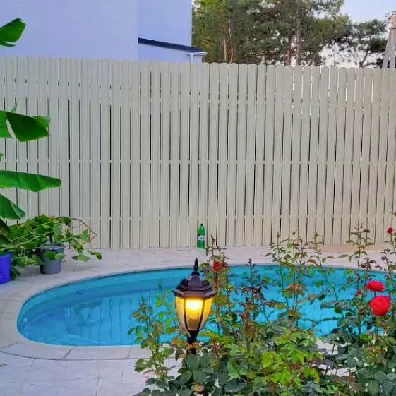 Палисадник из металлического штакетника (евроштакетника) «Узкий» в цвете RAL1015 Слоновая Кость выглядит особенно стильно и гармонично благодаря двустороннему покрытию. Забор одинаково привлекателен с обеих сторон и гармонично вписывается в общий облик участка. Забор из евроштакетника не только выполняет практичную функцию ограждения, но и становиться элементом декора. Аккуратные линии и светлый цвет придают легкость, создавая ощущение ухоженности и завершенности придомовой территории.